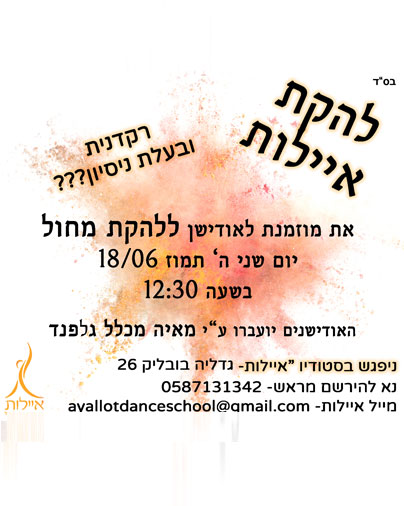 איילות, המרכז המקצועי למחול ותנועה במופע חדש! מתי? יום שלישי י’ תמוז | 4/07/17 מופע ראשון: 17:30 מופע שני: 20:00 היכן? אולם בית מזיא, רח’ מסילת ישרים 18 כרטיסים: ניתן להזמין בטלפון: 058-713-1342 (מחיר כרטיס 60 ש”ח, בהזמנה מראש – 50 ש”ח)